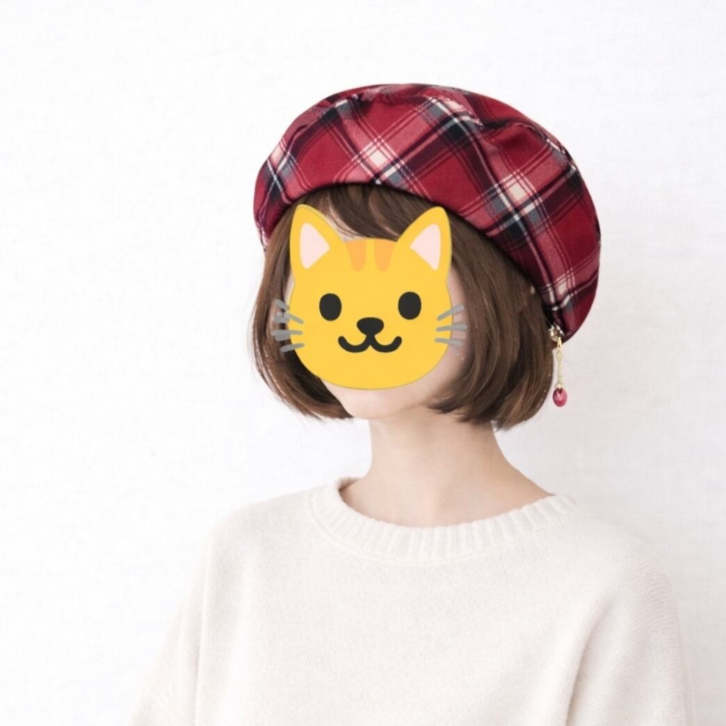 大柄のレッドチェック柄が目を引くベレー帽。