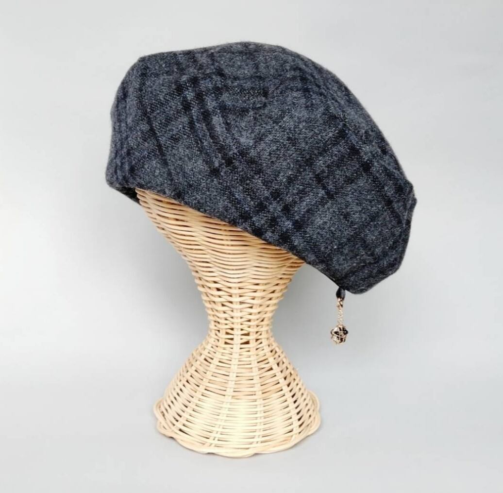 上質「尾州ウール」ベレー帽 大人グレーチェック チャームが付けられる 帽子 秋 冬 プレゼントにも クリスマス ブルー S.M.L.LLサイズ