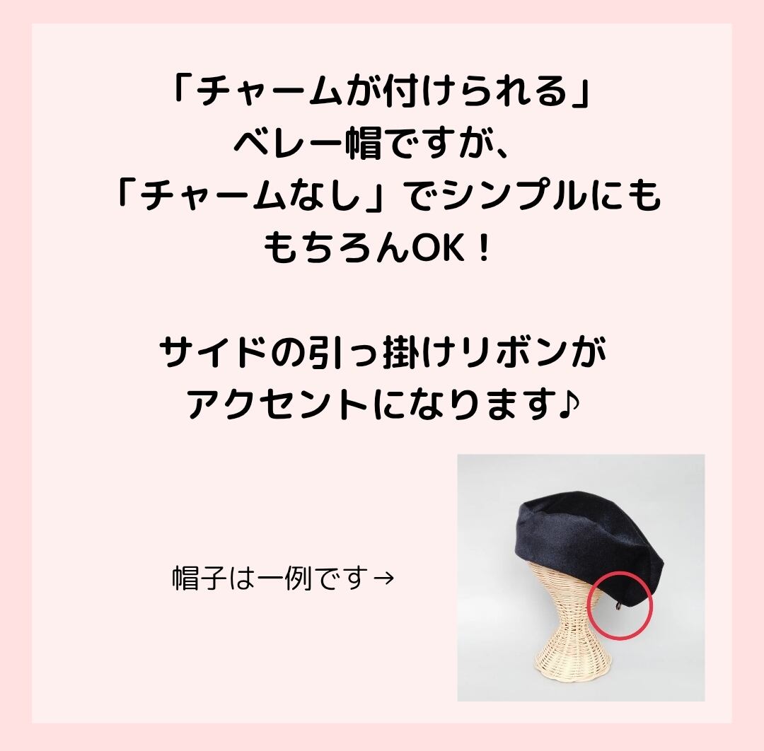 お手持ちのチャームを付け替えると、一つのベレー帽が何通りにも見えますので、オトクです。