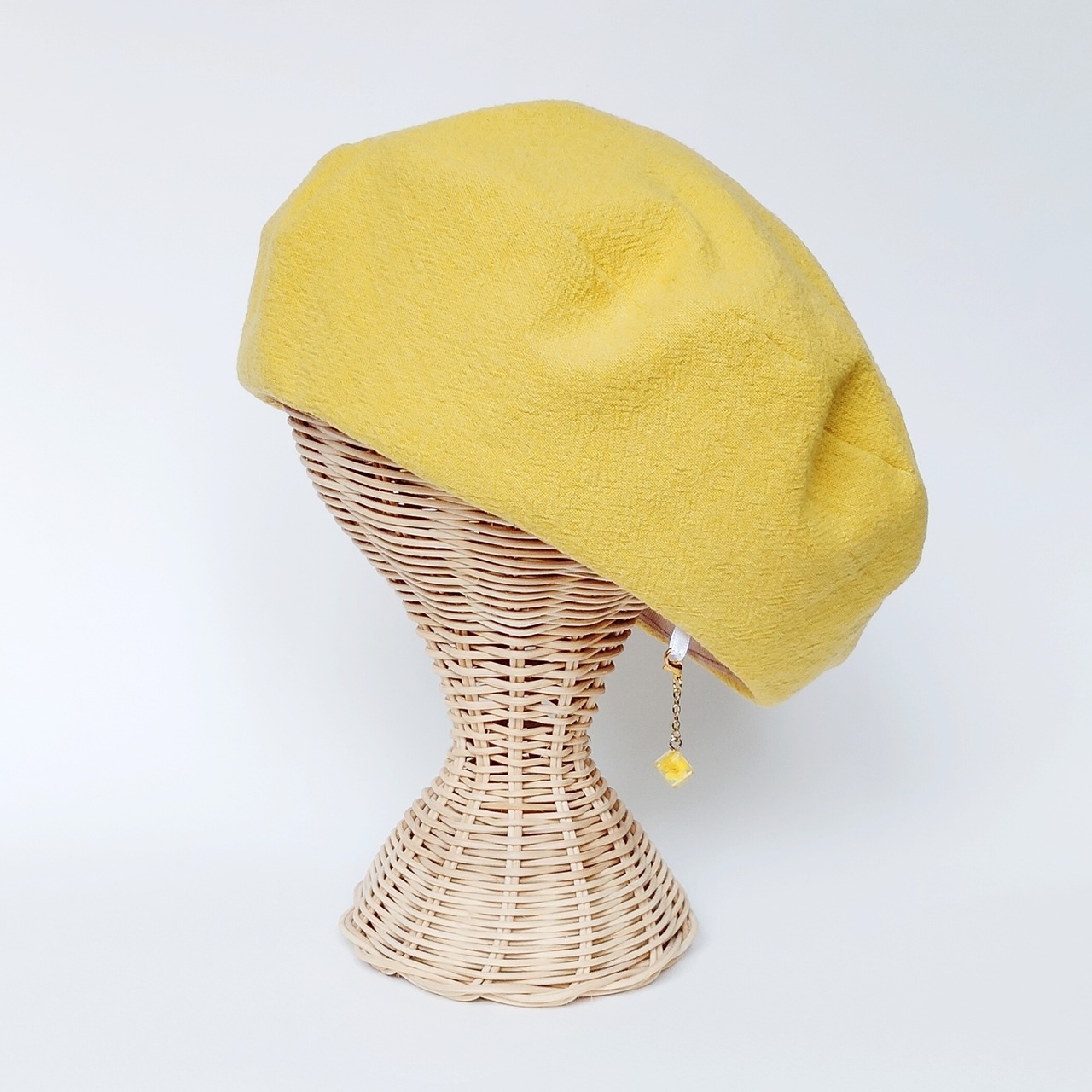 秋の差し色に イエローコットンリネンベレー帽 チャームが付けられる オーダーメイド S.M.L.LLサイズ