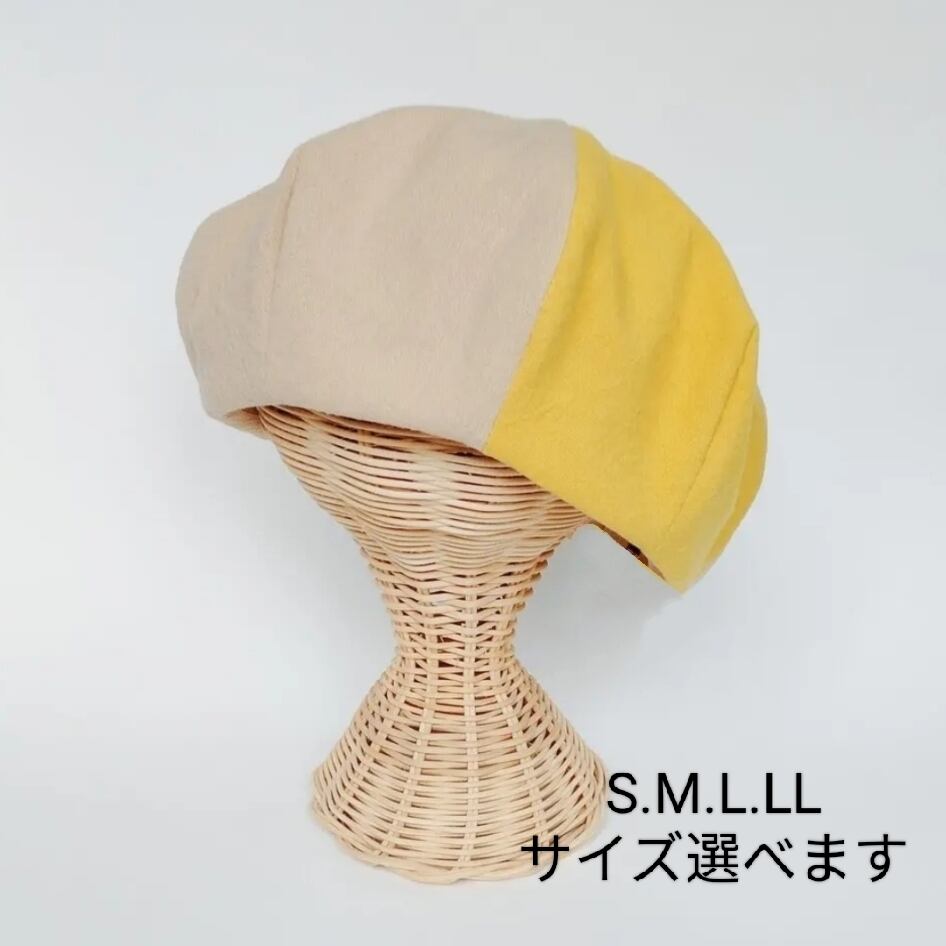 アレンジ自在!イエロー×ベージュベレー帽 コットンリネン 帽子 日差しに オーダーメイド S.M.L.LLサイズ