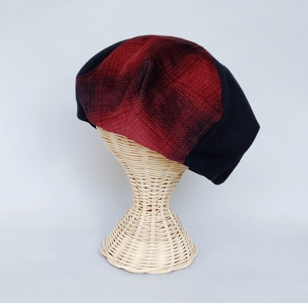 アレンジ自在!レッドチェック×ブラックウールベレー帽 帽子 オーダーメイド S.M.L.LLサイズ