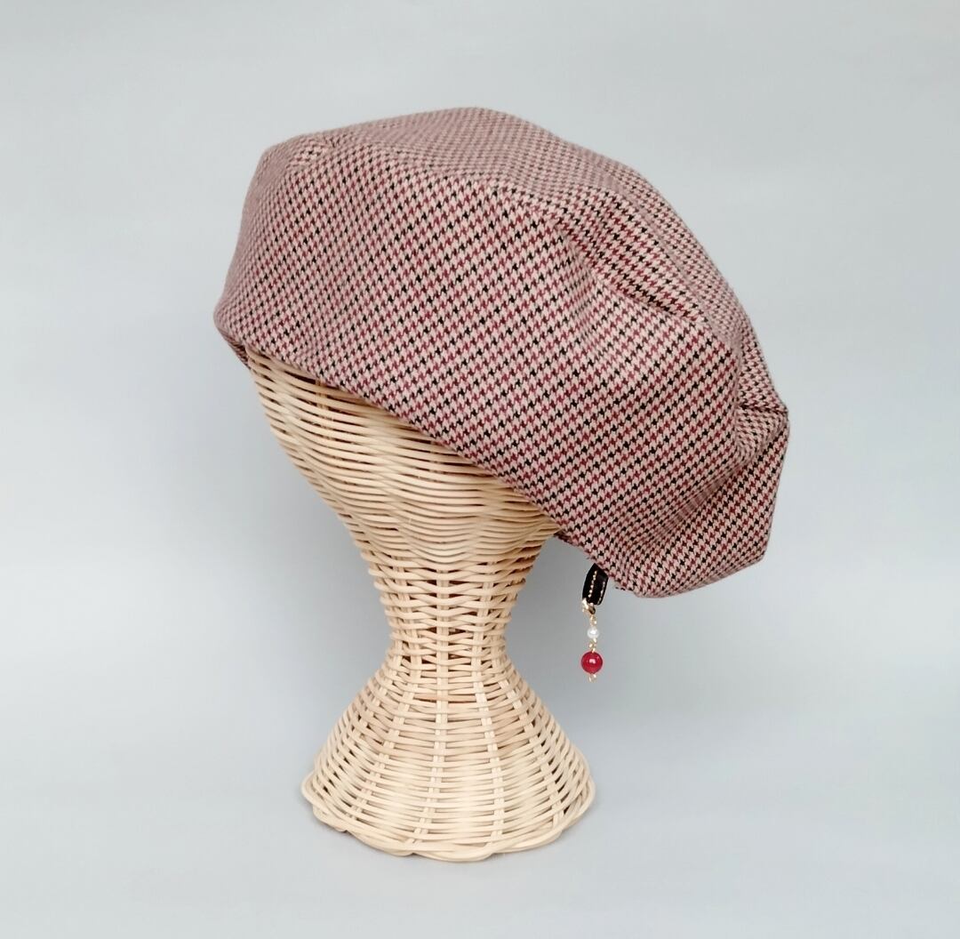 今回はブラウンベースに、温かみのあるボルドー系、レンガ色の千鳥格子が入ったベレー帽。